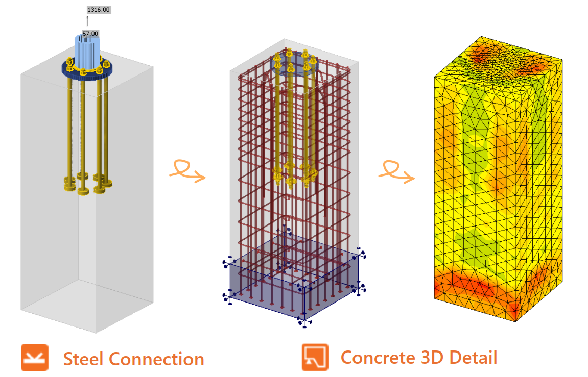 To resolve this, the anchorage model was exported to IDEA StatiCa Detail. Here, the pedestal could be evaluated with its actual reinforcement and geometry using a nonlinear 3D analysis.
