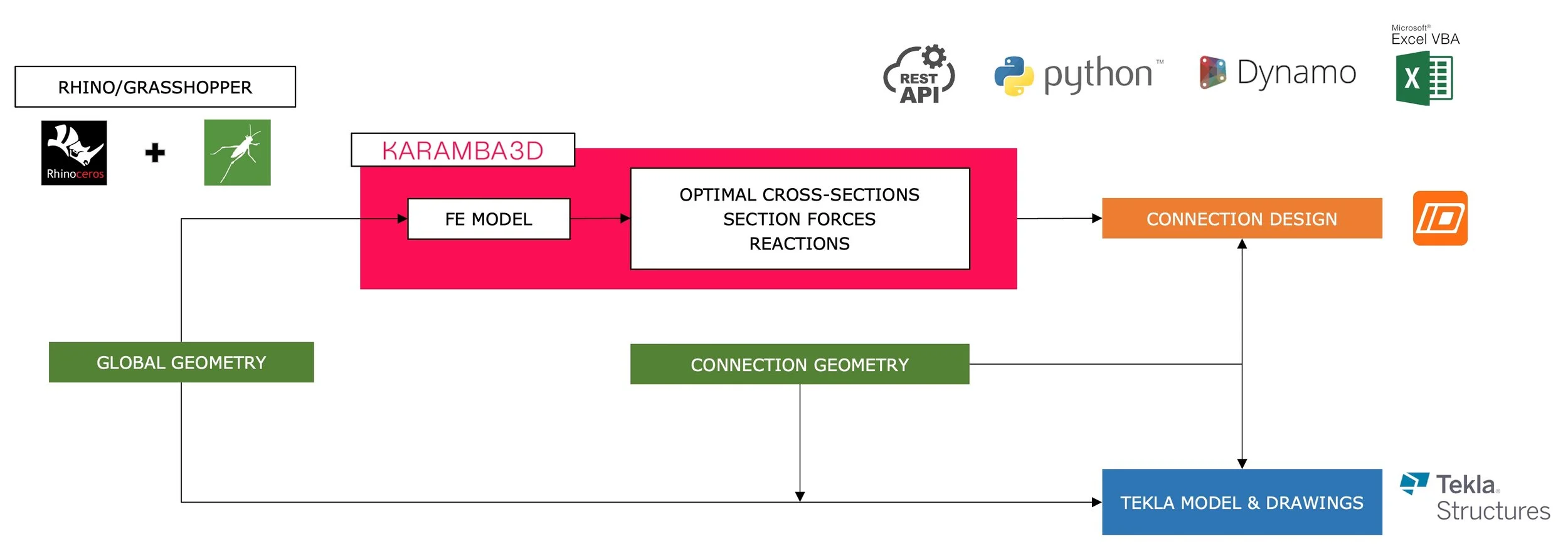 Global model parametric modelling with Dynamo, Python & Excel VBA. Connections Parametric templates connection library & API and some Parametric modelling with Grasshopper/Rhino and Karamba.