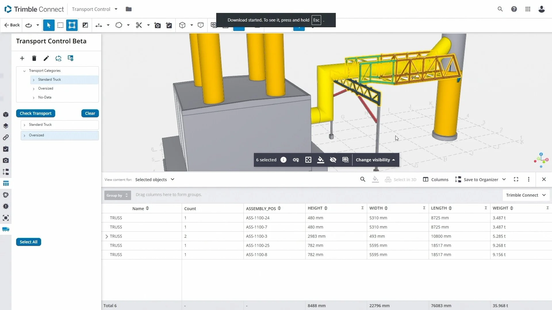 IMAGE: Trimble Connect Transport Control extension lets you quickly review size and weight of all assemblies and identify transport needs — or potential oversize/overweight issues!